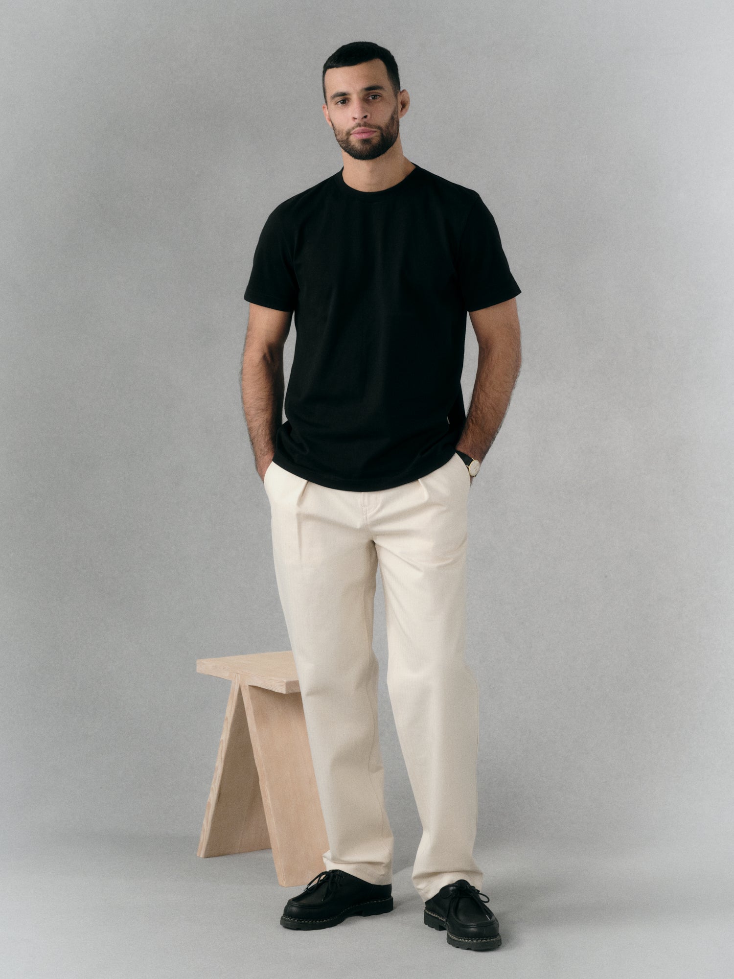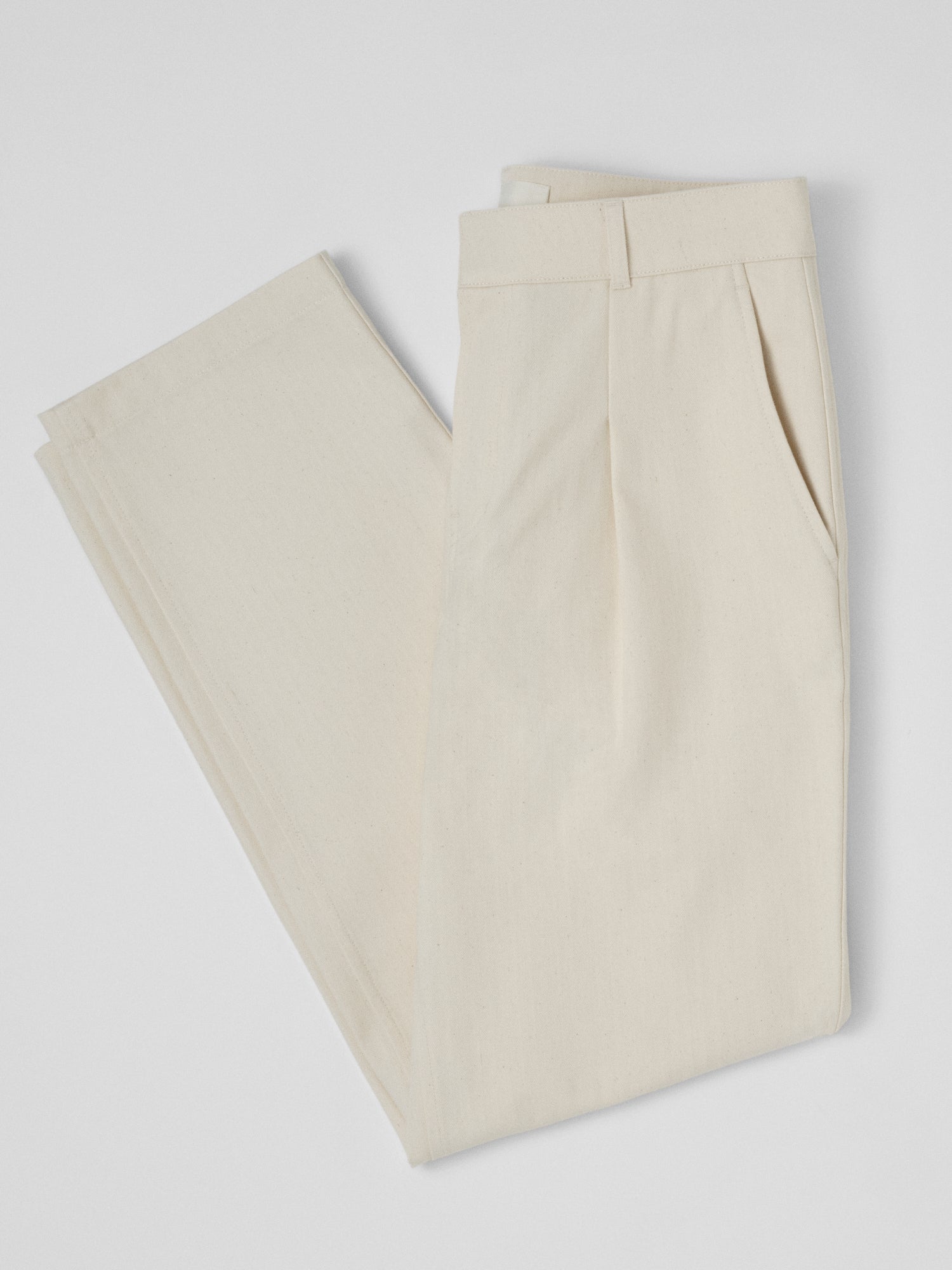 The pleated pant reimagined, refined front pleats, balanced volume, and a considered hem height for versatile styling from desk to evening.